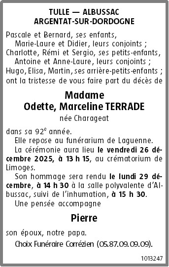 Déroulement des funérailles de Madame Odette Marceline TERRADE